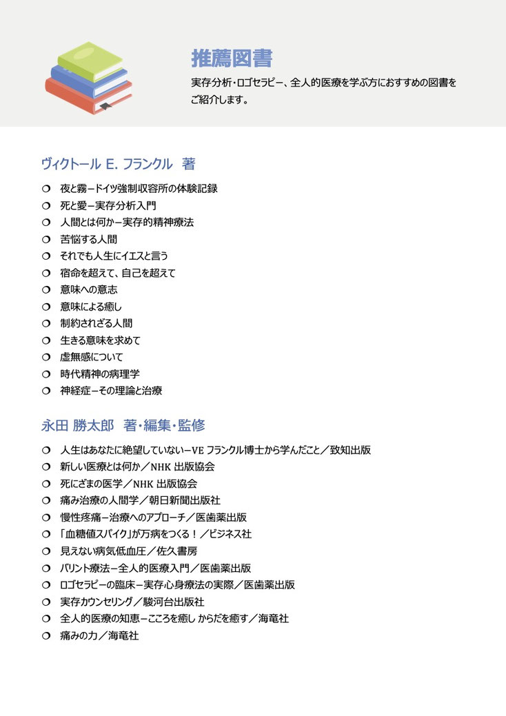 実存分析・ロゴセラピー、全人的医療を学ぶ方におすすめの図書をご紹介します。