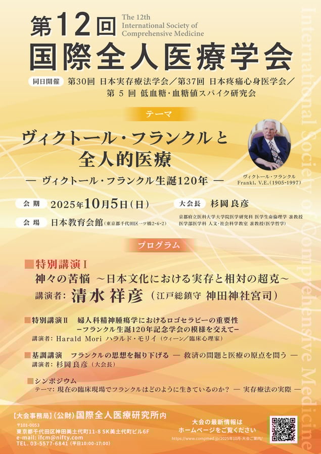 国際全人医療学会 · 2025/05/09 第12回国際全人医療学会のご案内 第 12 回国際全人医療学会を 2025 年 10 月 5 日に開催します。 第1回の国際全人医療学会は、1993年のビクトール・フランクル博士の来日を機に、故永田勝太郎博士によって結成されました。 本年2025年はフランクル生誕120年の記念すべき年となります。この記念すべき年に開かれる本学会では、再度フランクルの思想を問い直すとともに、実存療法に基づきながら、臨床現場で具体的にどのように全人医療が可能であるのかを実践的な観点からも皆様と考えてみたいと思います。 大会詳細はこちらから 参加お申込みはこちら tagPlaceholderカテゴリ: