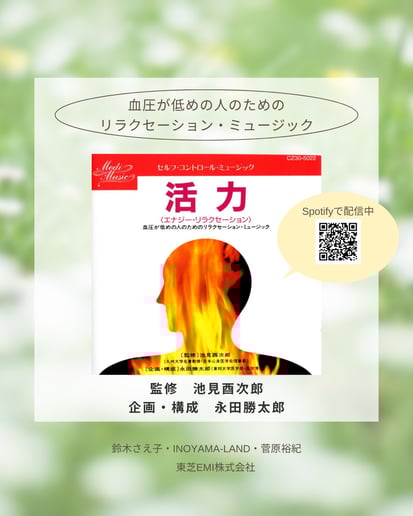 2025/10/28 「活力」ー血圧が低めの人のためのリラクセーション・ミュージックー 永田勝太郎先生は、音楽の生理学的影響に着目して実証研究を重ね、音楽が人間が本来持っている自己正常化機能(ホメオスタシス)を高める作用を明らかにしました。 その研究結果に基づいてリラクセーション用音楽を開発したのが、このセルフ・コントロール・ミュージック シリーズです。 「活力〈エナジー・リラクセーション〉」は、「血圧が低めの人のためのリラクセーション・ミュージック」として作られました。 ぜひ一度聴いてみてください。 現在、spotifyで配信中です。 eラーニングで、全人医療や実存分析(ロゴセラピー)を学びませんか? 興味のある講座だけを受講するスポット受講も可能です。 eラーニングの詳細、お申し込みはこちらから tagPlaceholderカテゴリ: コメントをお書きください コメント: 0