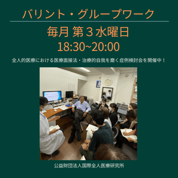 さて、こうした面接が、一般の外来レベルでもできるように医師を訓練するのが、バリント・グループ・ワークである。今日、世界的に認められている教育方法であり、国際的には、全人的医療の卒前・卒後教育として、世界各地で実践されている(国際組織には国際バリント連盟がある)。スイスのアスコナで始められたアスコナ方式のバリント・グループ・ワークは、医師のみならず医学生、看護師、医療ソーシャルワーカーなど医療に関した多職種の参加するグループ・ワークとして有名であり、WHO(世界保健機構)も推奨している方法である。我々もこの方法を採用している。